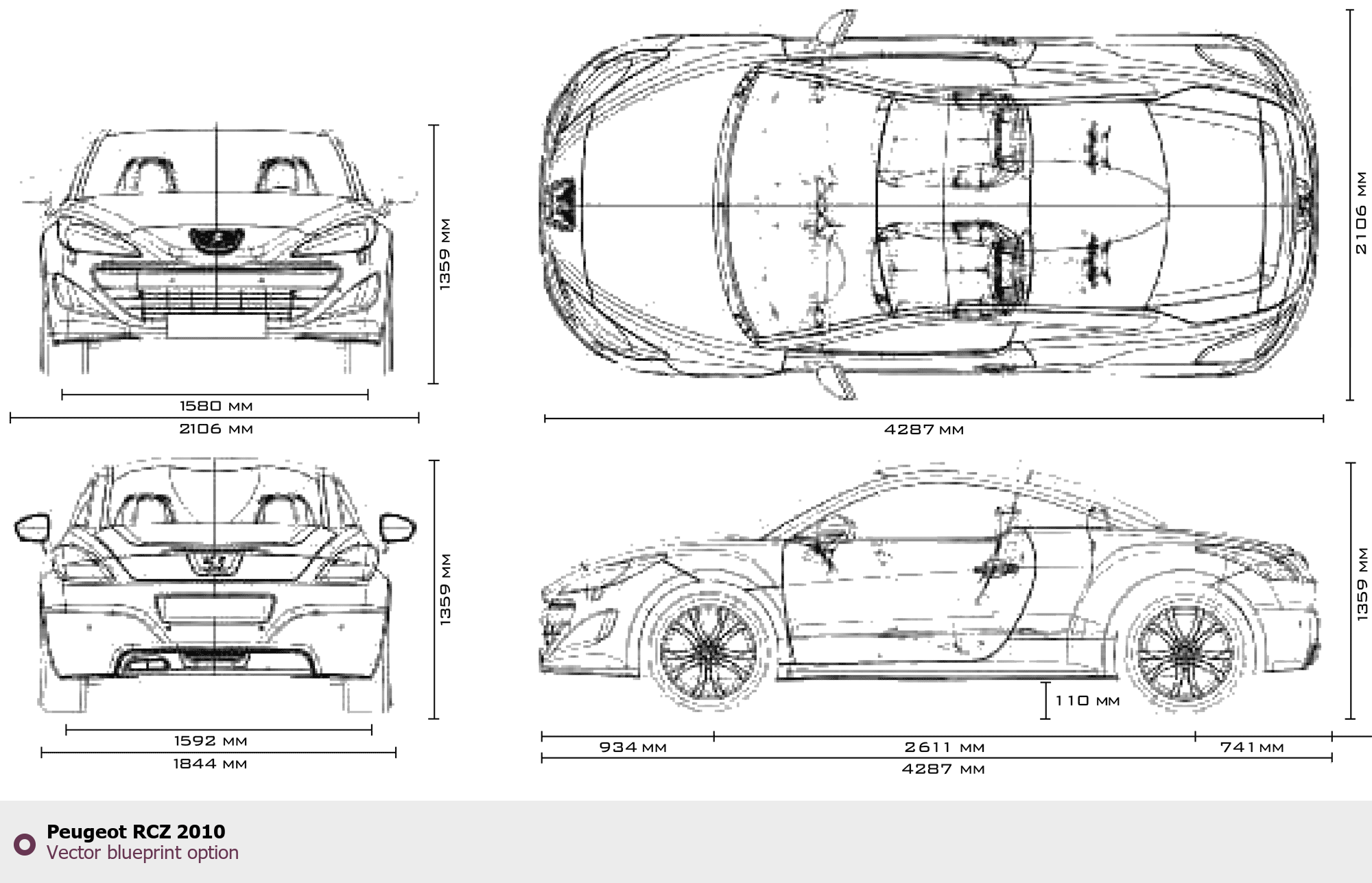 Raster blueprint of the 2010 Peugeot RCZ Coupe. This free downloadable image can be used for graphic projects, digital design, and 3D modeling. The file provides accurate exterior proportions of the vehicle. Model year: 2010. Body type: Coupe.
