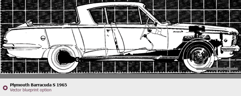 Raster blueprint of the 1965 Plymouth Barracuda S Coupe. This free downloadable image can be used for graphic projects, digital design, and 3D modeling. The file provides accurate exterior proportions of the vehicle. Model year: 1965. Body type: Coupe.