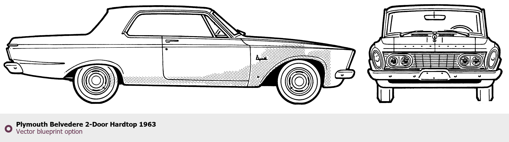 Raster blueprint of the 1963 Plymouth Belvedere 2-Door Hardtop Tag. This free downloadable image can be used for graphic projects, digital design, and 3D modeling. The file provides accurate exterior proportions of the vehicle. Model year: 1963. Body type: Tag.