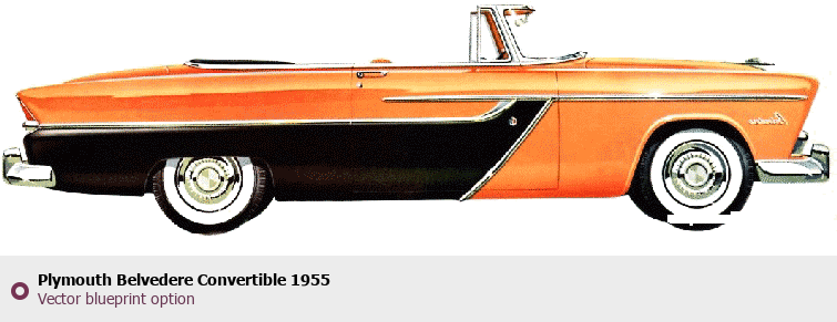 Raster blueprint of the 1955 Plymouth Belvedere Convertible Cabriolet. This free downloadable image can be used for graphic projects, digital design, and 3D modeling. The file provides accurate exterior proportions of the vehicle. Model year: 1955. Body type: Cabriolet.