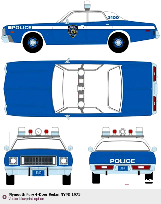 Raster blueprint of the 1975 Plymouth Fury 4-Door Sedan NYPD Wagon. This free downloadable image can be used for graphic projects, digital design, and 3D modeling. The file provides accurate exterior proportions of the vehicle. Model year: 1975. Body type: Wagon.