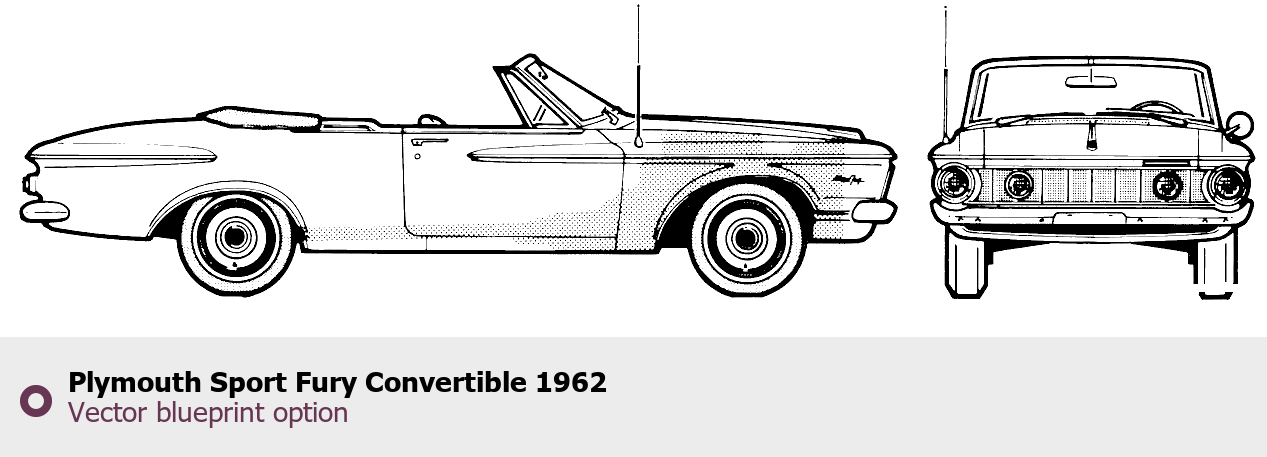 Raster blueprint of the 1962 Plymouth Sport Fury Convertible Cabriolet. This free downloadable image can be used for graphic projects, digital design, and 3D modeling. The file provides accurate exterior proportions of the vehicle. Model year: 1962. Body type: Cabriolet.
