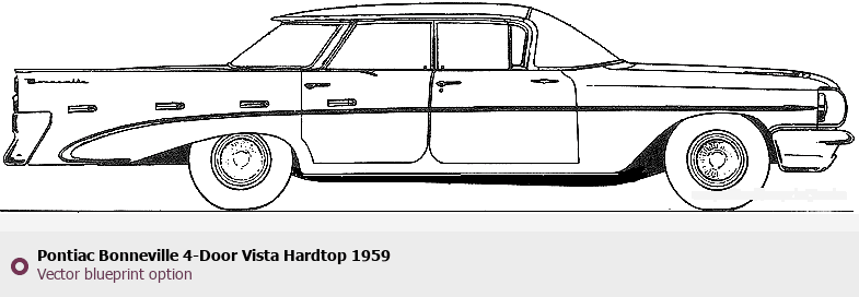 Raster blueprint of the 1959 Pontiac Bonneville 4-Door Vista Hardtop Tag. This free downloadable image can be used for graphic projects, digital design, and 3D modeling. The file provides accurate exterior proportions of the vehicle. Model year: 1959. Body type: Tag.
