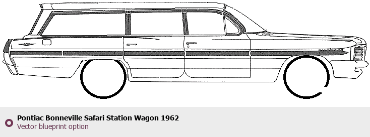 Raster blueprint of the 1962 Pontiac Bonneville Safari Station Wagon Wagon. This free downloadable image can be used for graphic projects, digital design, and 3D modeling. The file provides accurate exterior proportions of the vehicle. Model year: 1962. Body type: Wagon.