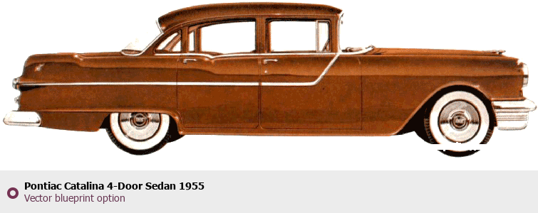 Raster blueprint of the 1955 Pontiac Catalina 4-Door Sedan Sedan. This free downloadable image can be used for graphic projects, digital design, and 3D modeling. The file provides accurate exterior proportions of the vehicle. Model year: 1955. Body type: Sedan.