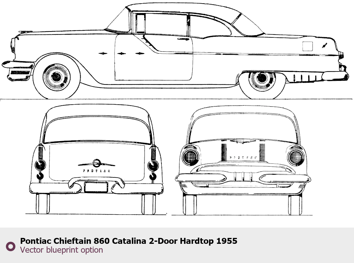 Raster blueprint of the 1955 Pontiac Chieftain 860 Catalina 2-Door Hardtop Tag. This free downloadable image can be used for graphic projects, digital design, and 3D modeling. The file provides accurate exterior proportions of the vehicle. Model year: 1955. Body type: Tag.