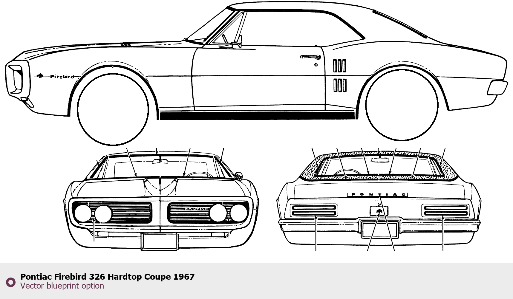 Raster blueprint of the 1967 Pontiac Firebird 326 Hardtop Coupe Coupe. This free downloadable image can be used for graphic projects, digital design, and 3D modeling. The file provides accurate exterior proportions of the vehicle. Model year: 1967. Body type: Coupe.