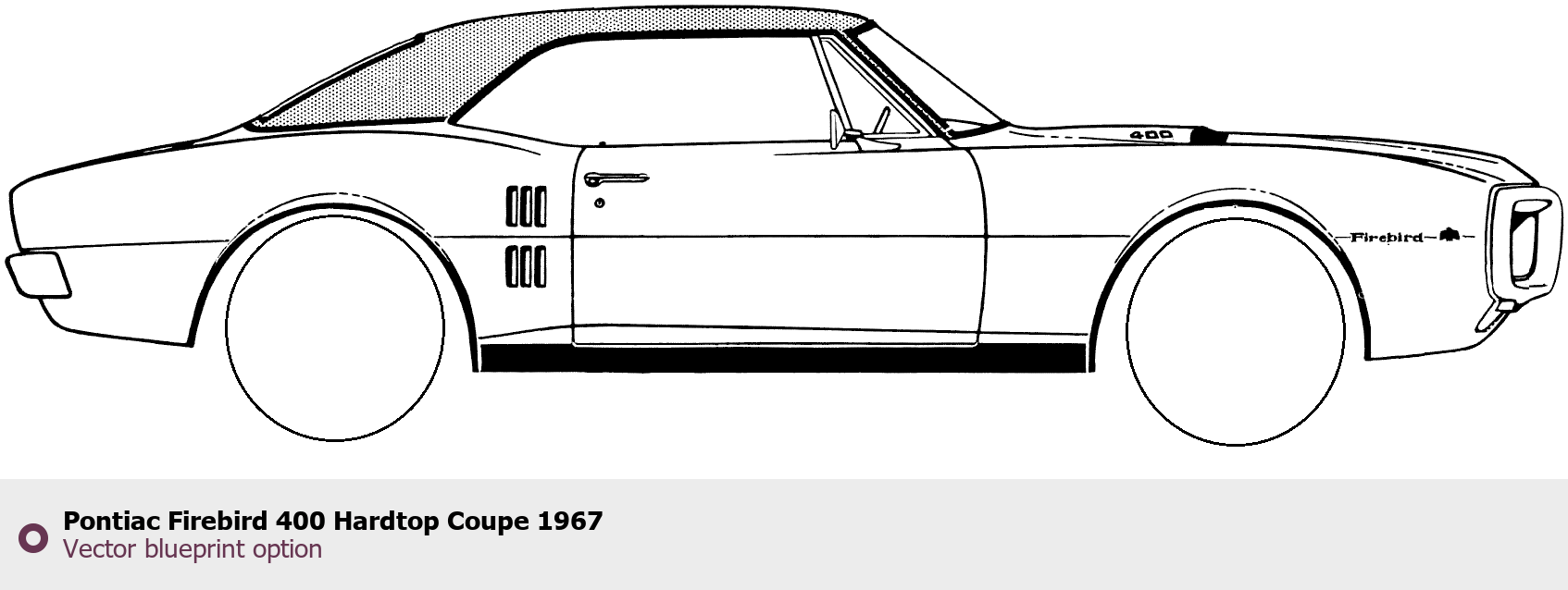Raster blueprint of the 1967 Pontiac Firebird 400 Hardtop Coupe Coupe. This free downloadable image can be used for graphic projects, digital design, and 3D modeling. The file provides accurate exterior proportions of the vehicle. Model year: 1967. Body type: Coupe.
