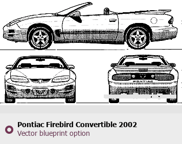 Raster blueprint of the 2002 Pontiac Firebird Convertible Coupe. This free downloadable image can be used for graphic projects, digital design, and 3D modeling. The file provides accurate exterior proportions of the vehicle. Model year: 2002. Body type: Coupe.