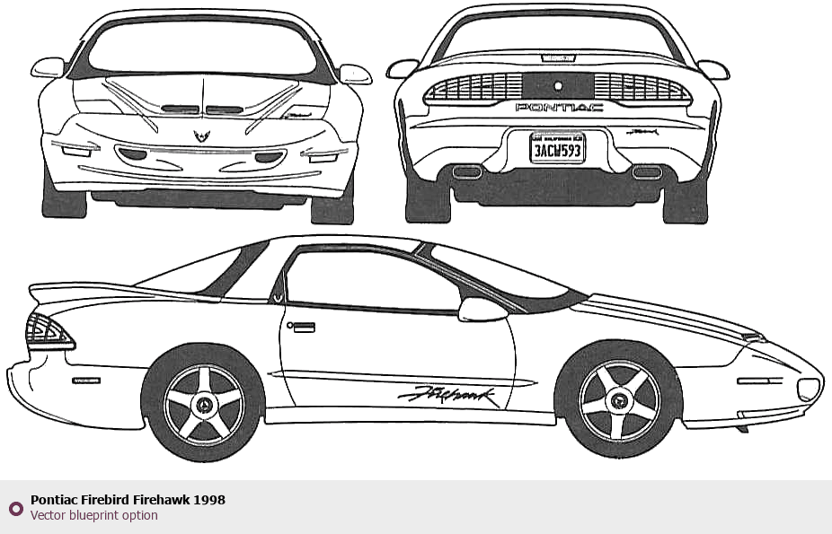 Raster blueprint of the 1998 Pontiac Firebird Firehawk Coupe. This free downloadable image can be used for graphic projects, digital design, and 3D modeling. The file provides accurate exterior proportions of the vehicle. Model year: 1998. Body type: Coupe.