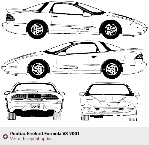 Raster blueprint of the 2001 Pontiac Firebird Formula V8 Coupe. This free downloadable image can be used for graphic projects, digital design, and 3D modeling. The file provides accurate exterior proportions of the vehicle. Model year: 2001. Body type: Coupe.