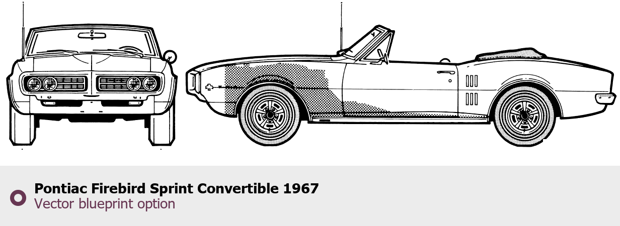 Raster blueprint of the 1967 Pontiac Firebird Sprint Convertible Coupe. This free downloadable image can be used for graphic projects, digital design, and 3D modeling. The file provides accurate exterior proportions of the vehicle. Model year: 1967. Body type: Coupe.