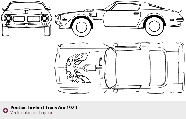 Raster blueprint of the 1973 Pontiac Firebird Trans Am Coupe. This free downloadable image can be used for graphic projects, digital design, and 3D modeling. The file provides accurate exterior proportions of the vehicle. Model year: 1973. Body type: Coupe.