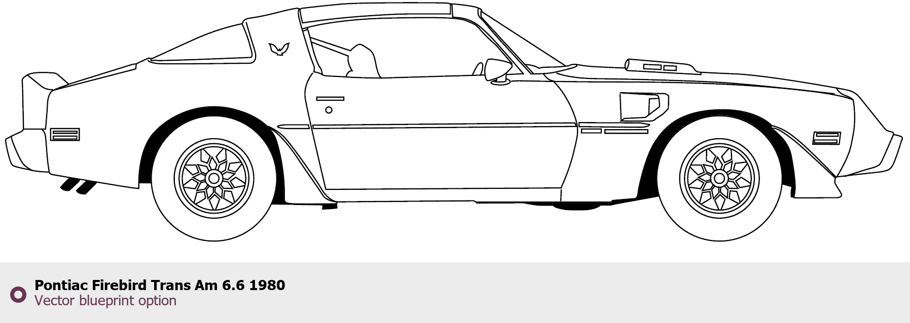 Raster blueprint of the 1980 Pontiac Firebird Trans Am 6.6 Coupe. This free downloadable image can be used for graphic projects, digital design, and 3D modeling. The file provides accurate exterior proportions of the vehicle. Model year: 1980. Body type: Coupe.