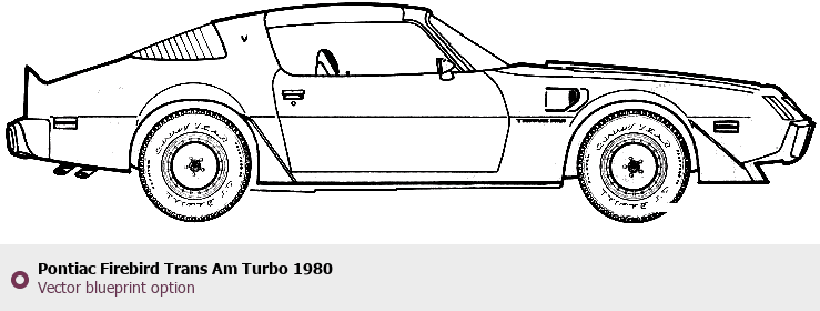 Raster blueprint of the 1980 Pontiac Firebird Trans Am Turbo Coupe. This free downloadable image can be used for graphic projects, digital design, and 3D modeling. The file provides accurate exterior proportions of the vehicle. Model year: 1980. Body type: Coupe.