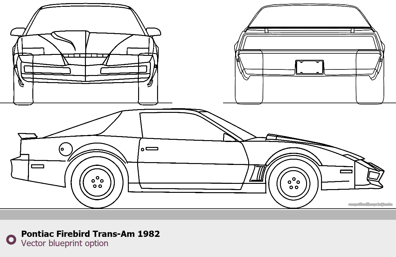 Raster blueprint of the 1982 Pontiac Firebird Trans-Am Coupe. This free downloadable image can be used for graphic projects, digital design, and 3D modeling. The file provides accurate exterior proportions of the vehicle. Model year: 1982. Body type: Coupe.