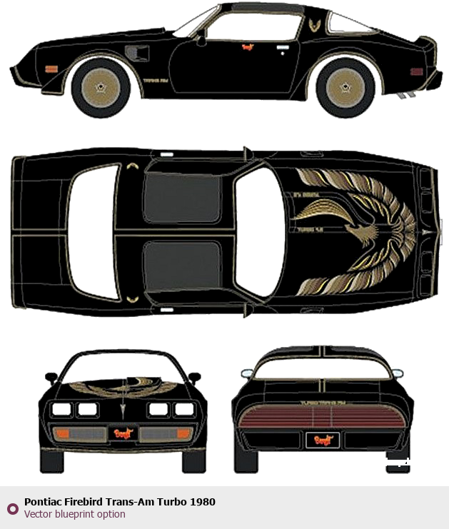 Raster blueprint of the 1980 Pontiac Firebird Trans-Am Turbo Coupe. This free downloadable image can be used for graphic projects, digital design, and 3D modeling. The file provides accurate exterior proportions of the vehicle. Model year: 1980. Body type: Coupe.
