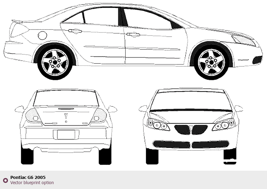 Raster blueprint of the 2005 Pontiac G6 Tag. This free downloadable image can be used for graphic projects, digital design, and 3D modeling. The file provides accurate exterior proportions of the vehicle. Model year: 2005. Body type: Tag.