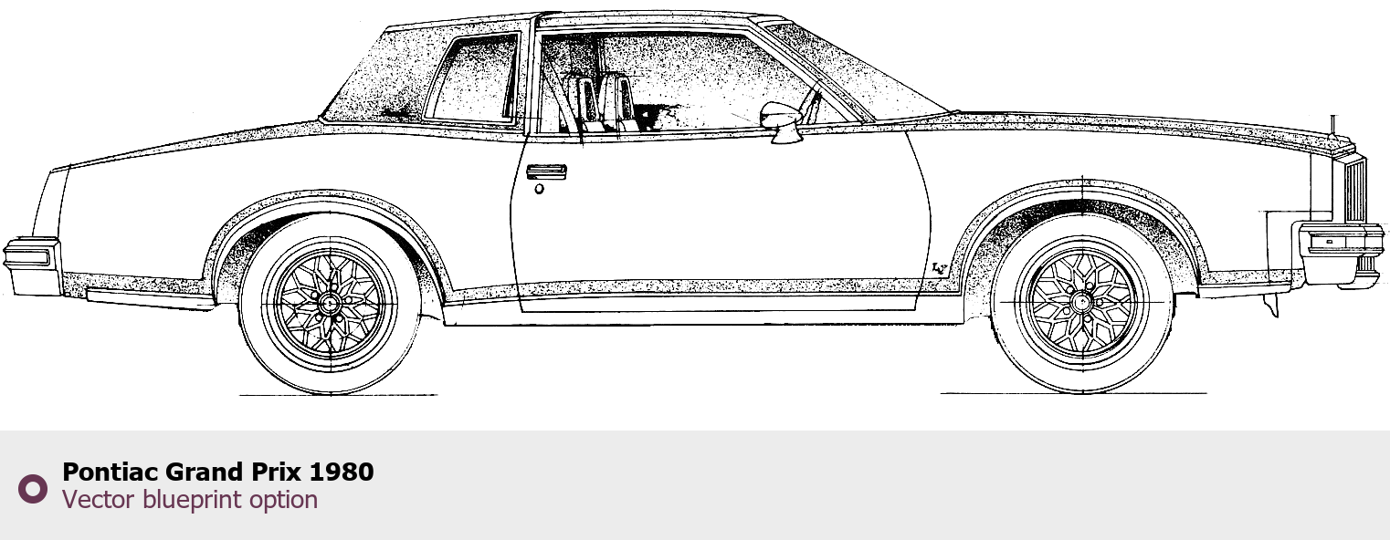 Raster blueprint of the 1980 Pontiac Grand Prix Coupe. This free downloadable image can be used for graphic projects, digital design, and 3D modeling. The file provides accurate exterior proportions of the vehicle. Model year: 1980. Body type: Coupe.