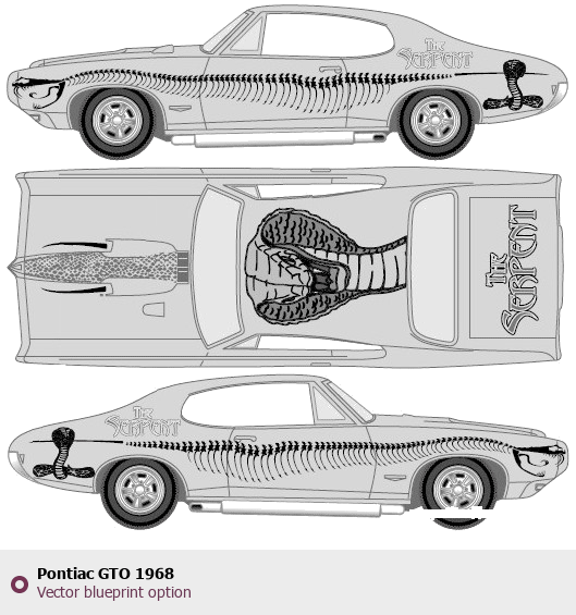 Raster blueprint of the 1968 Pontiac GTO Coupe. This free downloadable image can be used for graphic projects, digital design, and 3D modeling. The file provides accurate exterior proportions of the vehicle. Model year: 1968. Body type: Coupe.