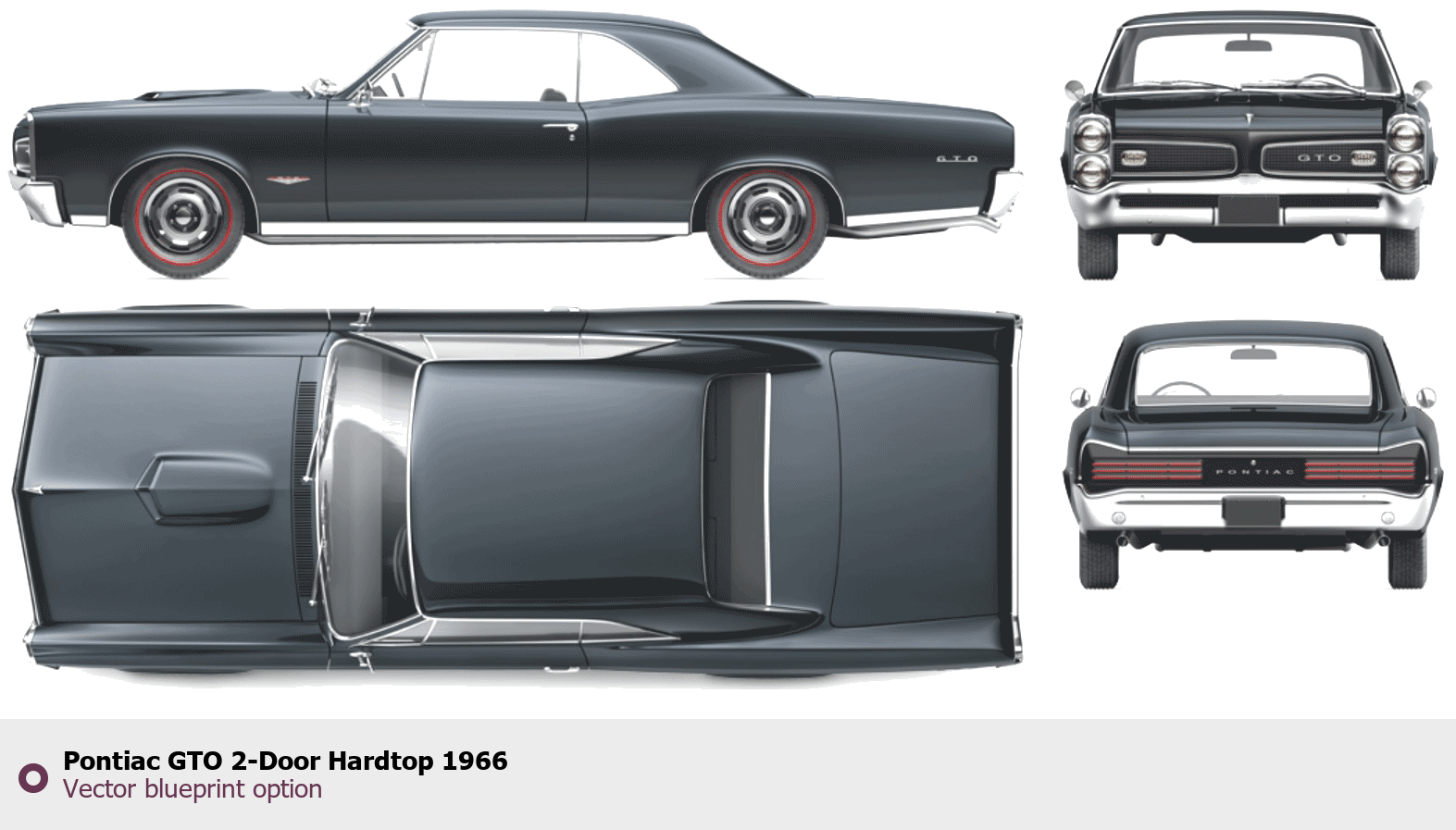 Raster blueprint of the 1966 Pontiac GTO 2-Door Hardtop Coupe. This free downloadable image can be used for graphic projects, digital design, and 3D modeling. The file provides accurate exterior proportions of the vehicle. Model year: 1966. Body type: Coupe.