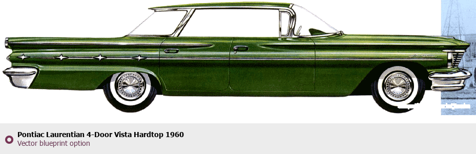 Raster blueprint of the 1960 Pontiac Laurentian 4-Door Vista Hardtop Tag. This free downloadable image can be used for graphic projects, digital design, and 3D modeling. The file provides accurate exterior proportions of the vehicle. Model year: 1960. Body type: Tag.