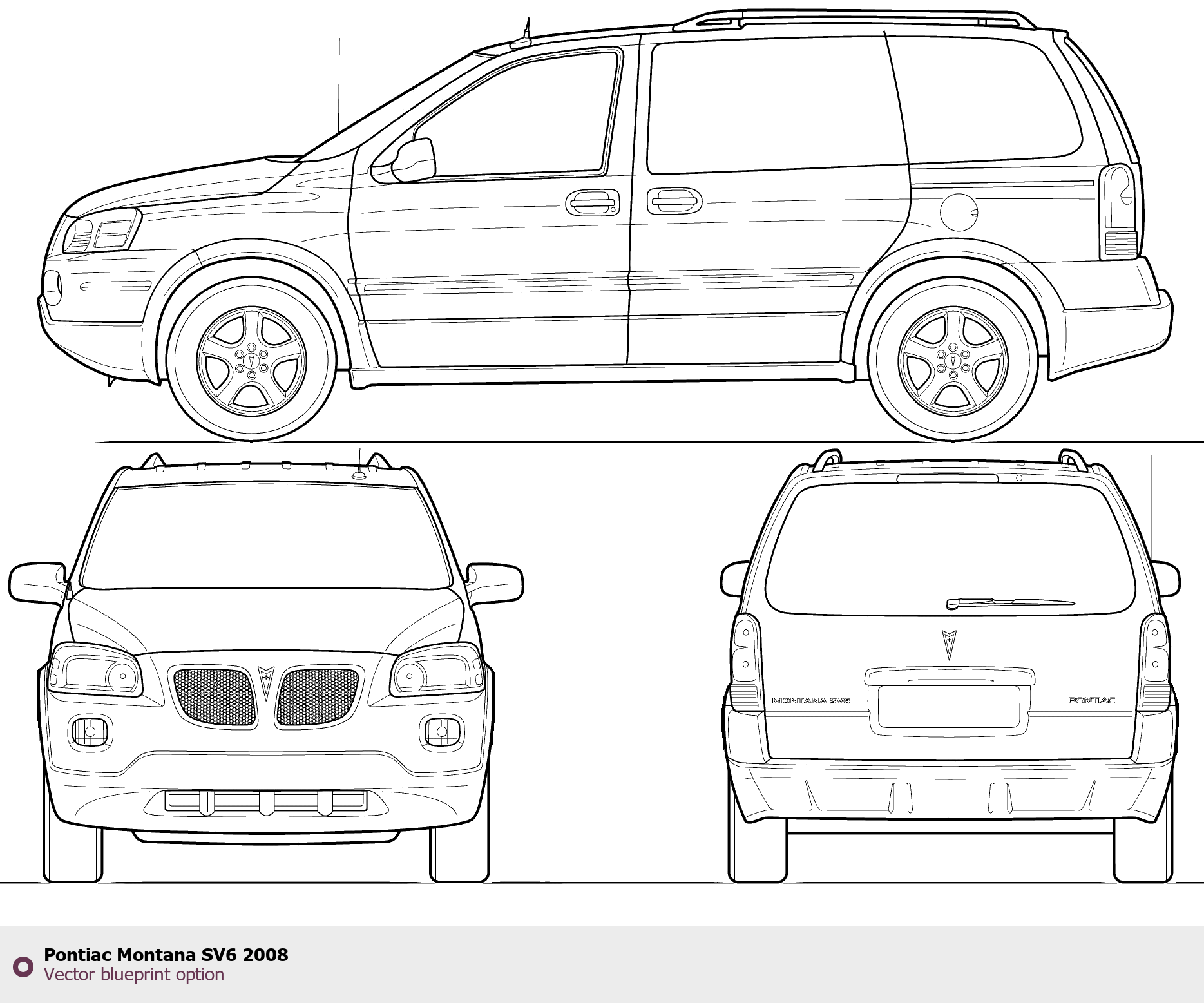 Raster blueprint of the 2008 Pontiac Montana SV6 Minivan. This free downloadable image can be used for graphic projects, digital design, and 3D modeling. The file provides accurate exterior proportions of the vehicle. Model year: 2008. Body type: Minivan.