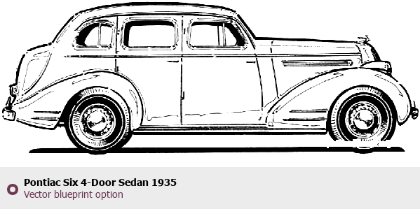 Raster blueprint of the 1935 Pontiac Six 4-Door Sedan Sedan. This free downloadable image can be used for graphic projects, digital design, and 3D modeling. The file provides accurate exterior proportions of the vehicle. Model year: 1935. Body type: Sedan.
