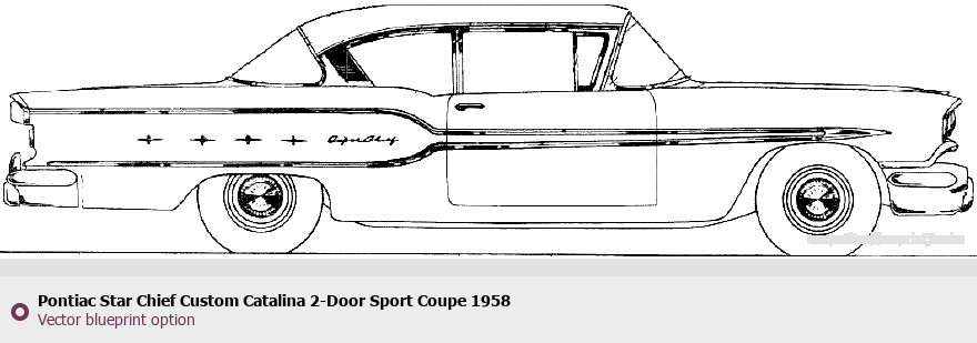 Raster blueprint of the 1958 Pontiac Star Chief Custom Catalina 2-Door Sport Coupe Coupe. This free downloadable image can be used for graphic projects, digital design, and 3D modeling. The file provides accurate exterior proportions of the vehicle. Model year: 1958. Body type: Coupe.
