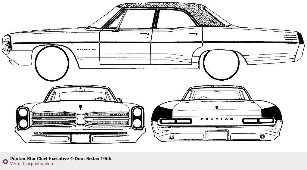 Raster blueprint of the 1966 Pontiac Star Chief Executive 4-Door Sedan Sedan. This free downloadable image can be used for graphic projects, digital design, and 3D modeling. The file provides accurate exterior proportions of the vehicle. Model year: 1966. Body type: Sedan.