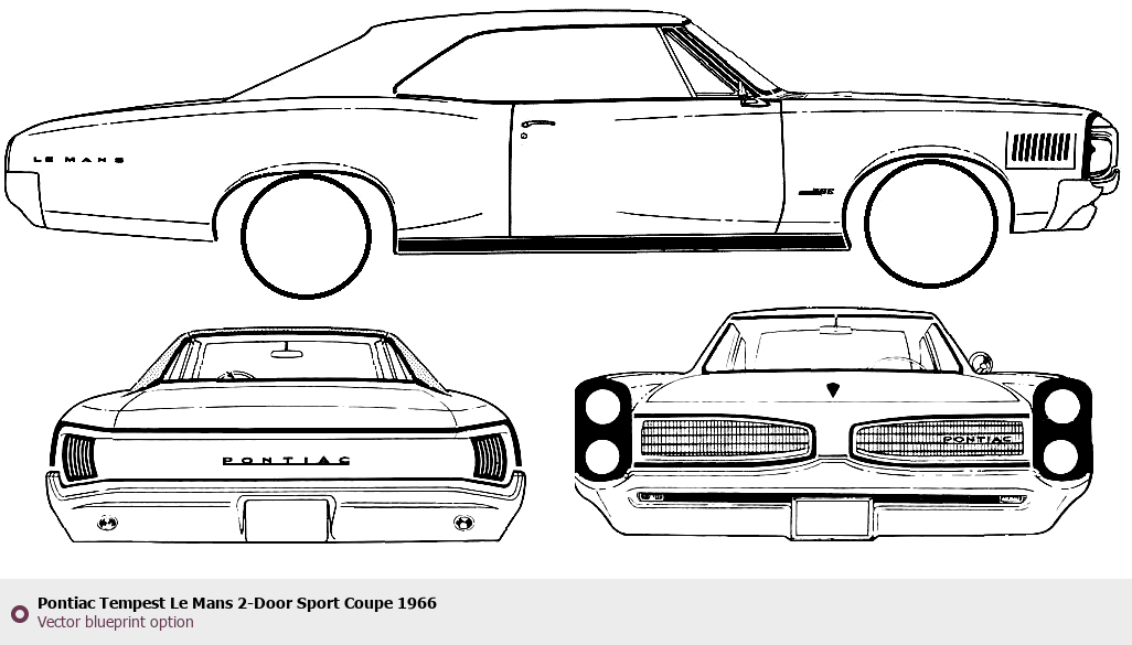 Raster blueprint of the 1966 Pontiac Tempest Le Mans 2-Door Sport Coupe Coupe. This free downloadable image can be used for graphic projects, digital design, and 3D modeling. The file provides accurate exterior proportions of the vehicle. Model year: 1966. Body type: Coupe.