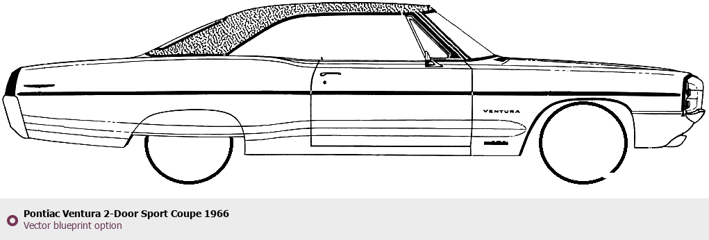 Raster blueprint of the 1966 Pontiac Ventura 2-Door Sport Coupe Coupe. This free downloadable image can be used for graphic projects, digital design, and 3D modeling. The file provides accurate exterior proportions of the vehicle. Model year: 1966. Body type: Coupe.