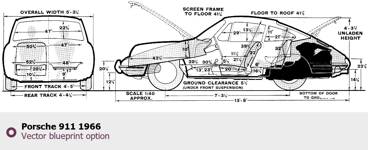 Raster blueprint of the 1966 Porsche 911 Tag. This free downloadable image can be used for graphic projects, digital design, and 3D modeling. The file provides accurate exterior proportions of the vehicle. Model year: 1966. Body type: Tag.