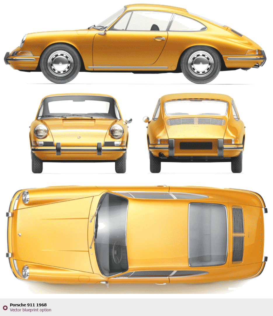 Raster blueprint of the 1968 Porsche 911 Tag. This free downloadable image can be used for graphic projects, digital design, and 3D modeling. The file provides accurate exterior proportions of the vehicle. Model year: 1968. Body type: Tag.