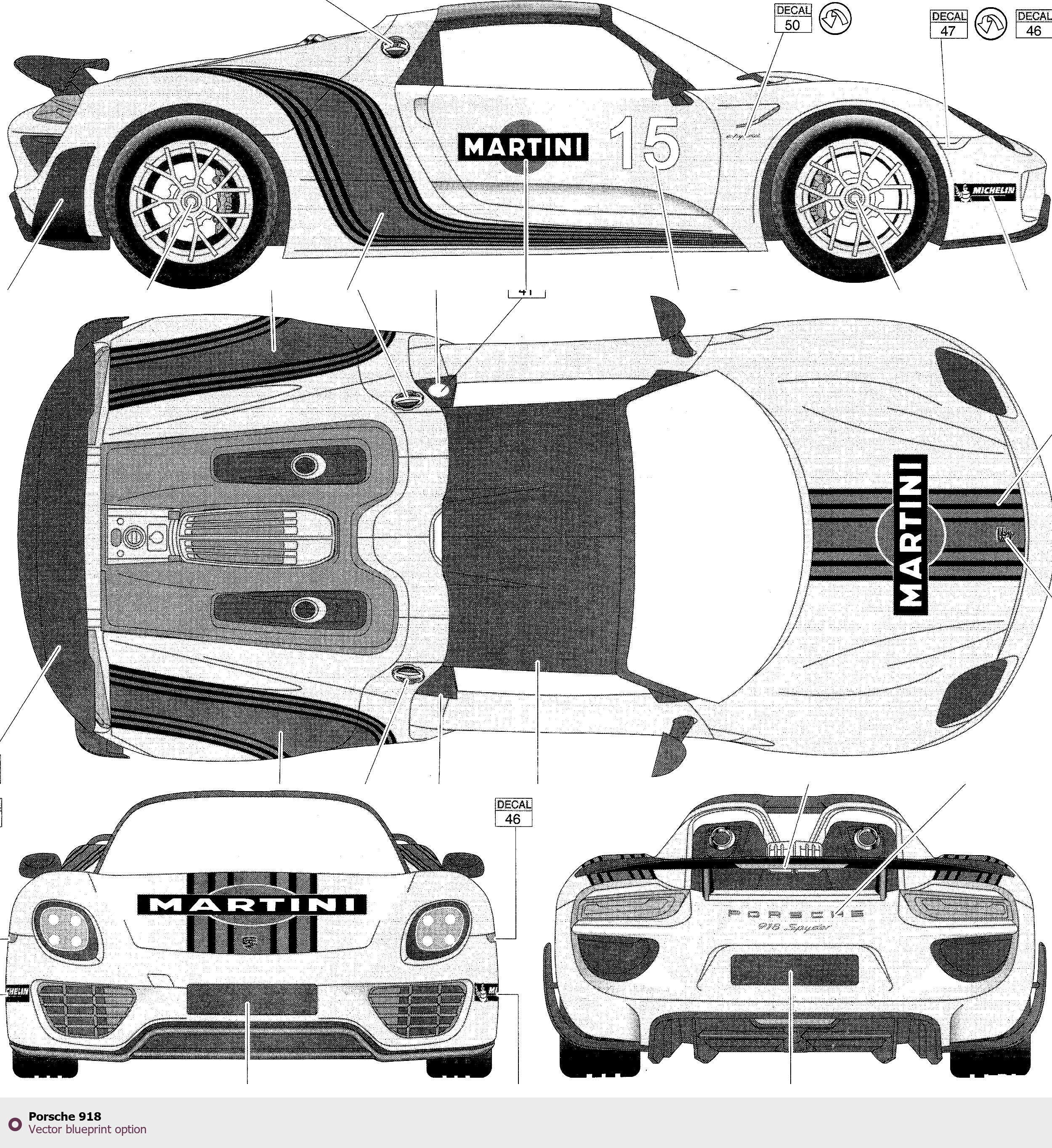 Raster blueprint of the Porsche 918 Coupe. This free downloadable image can be used for graphic projects, digital design, and 3D modeling. The file provides accurate exterior proportions of the vehicle. Body type: Coupe.