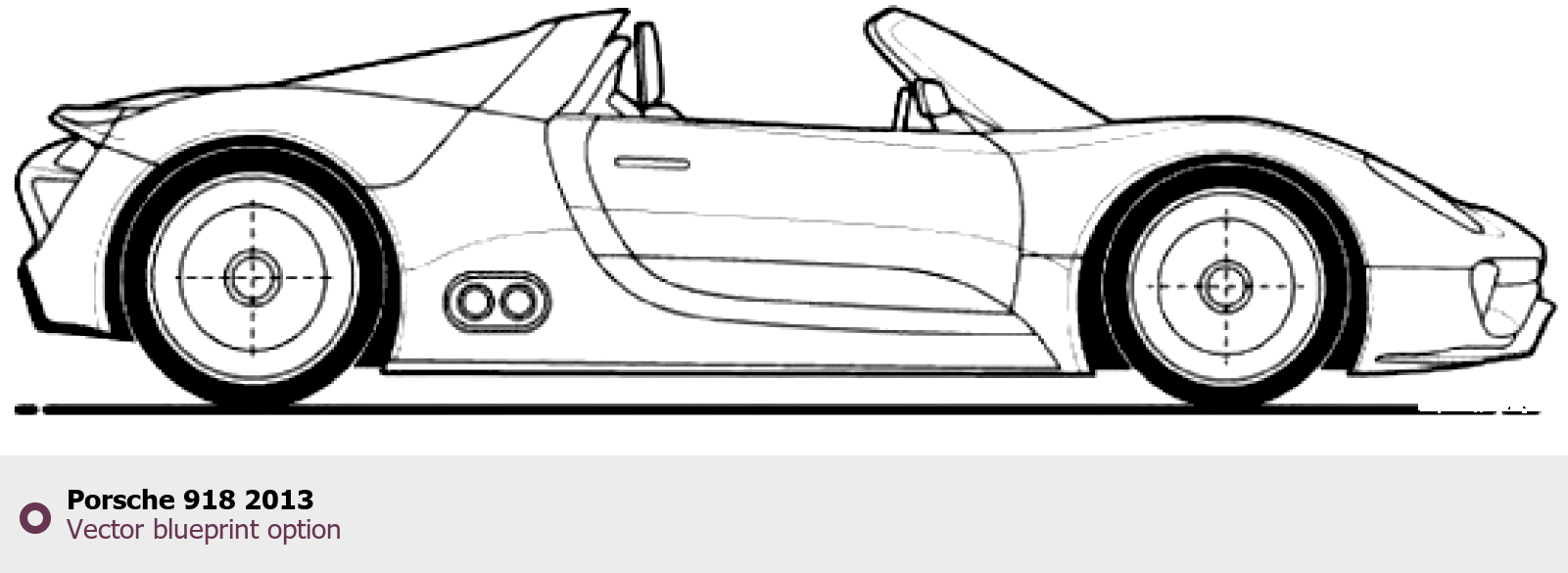 Raster blueprint of the 2013 Porsche 918 Coupe. This free downloadable image can be used for graphic projects, digital design, and 3D modeling. The file provides accurate exterior proportions of the vehicle. Model year: 2013. Body type: Coupe.