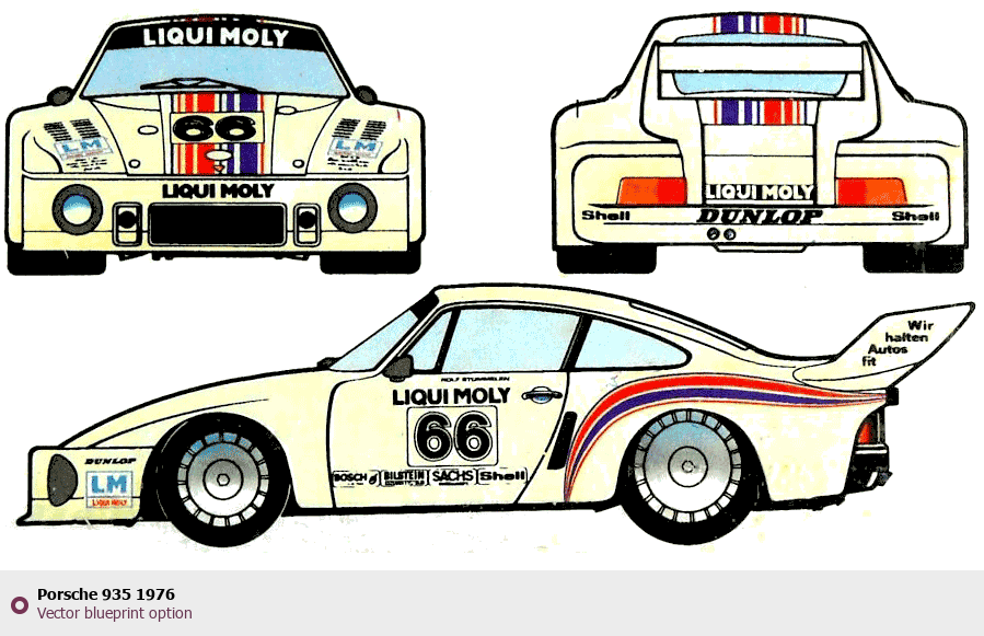 Raster blueprint of the 1976 Porsche 935 Tag. This free downloadable image can be used for graphic projects, digital design, and 3D modeling. The file provides accurate exterior proportions of the vehicle. Model year: 1976. Body type: Tag.