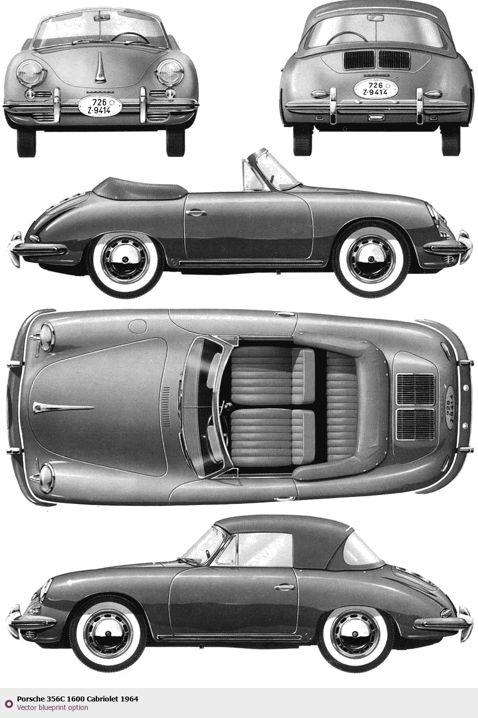 Raster blueprint of the 1964 Porsche 356C 1600 Cabriolet Cabriolet. This free downloadable image can be used for graphic projects, digital design, and 3D modeling. The file provides accurate exterior proportions of the vehicle. Model year: 1964. Body type: Cabriolet.