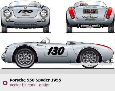 Raster blueprint of the 1955 Porsche 550 Spyder Roadster. This free downloadable image can be used for graphic projects, digital design, and 3D modeling. The file provides accurate exterior proportions of the vehicle. Model year: 1955. Body type: Roadster.
