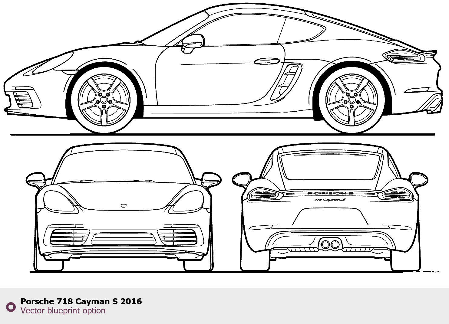 Raster blueprint of the 2016 Porsche 718 Cayman S Coupe. This free downloadable image can be used for graphic projects, digital design, and 3D modeling. The file provides accurate exterior proportions of the vehicle. Model year: 2016. Body type: Coupe.