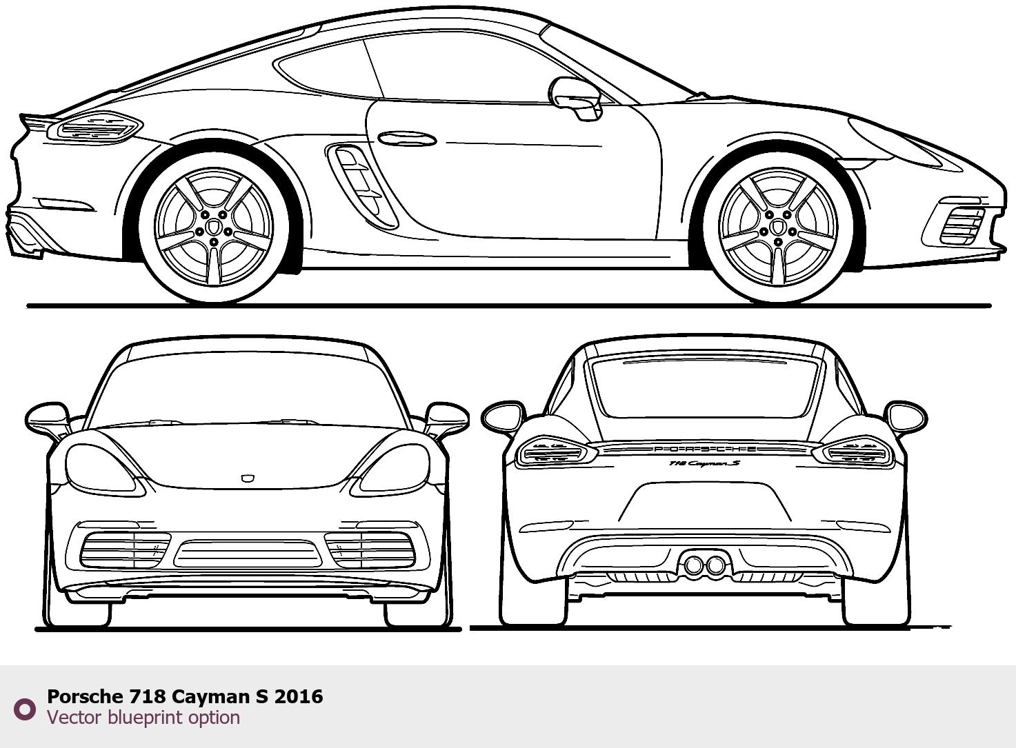 Raster blueprint of the 2016 Porsche 718 Cayman S Coupe. This free downloadable image can be used for graphic projects, digital design, and 3D modeling. The file provides accurate exterior proportions of the vehicle. Model year: 2016. Body type: Coupe.