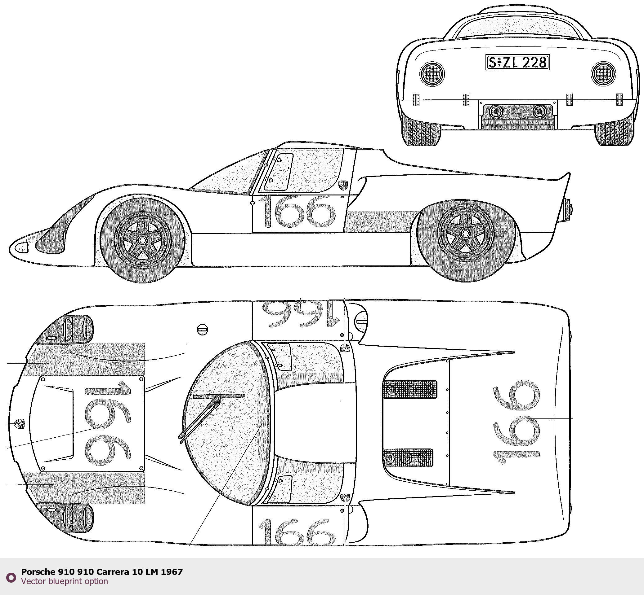Raster blueprint of the 1967 Porsche 910 910 Carrera 10 LM Tag. This free downloadable image can be used for graphic projects, digital design, and 3D modeling. The file provides accurate exterior proportions of the vehicle. Model year: 1967. Body type: Tag.