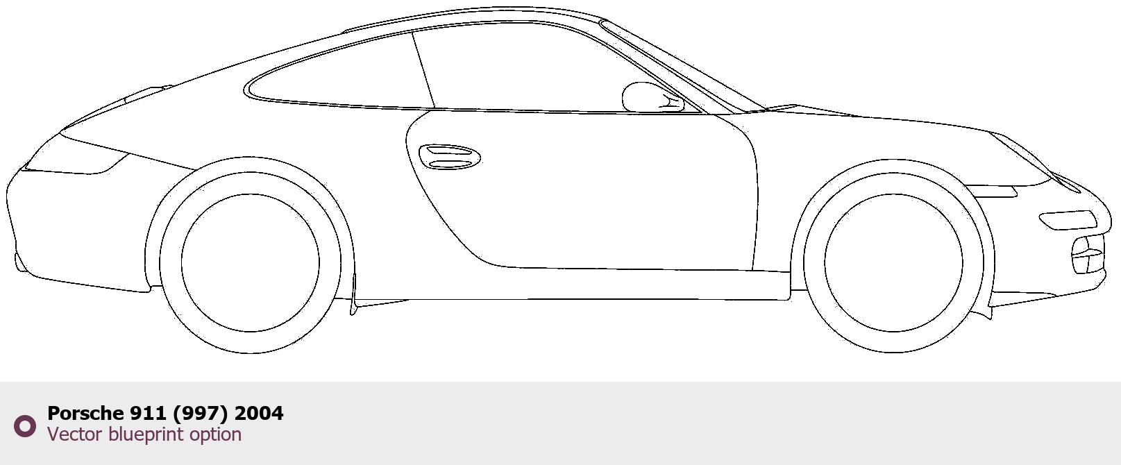 Raster blueprint of the 2004 Porsche 911 (997) Tag. This free downloadable image can be used for graphic projects, digital design, and 3D modeling. The file provides accurate exterior proportions of the vehicle. Model year: 2004. Body type: Tag.