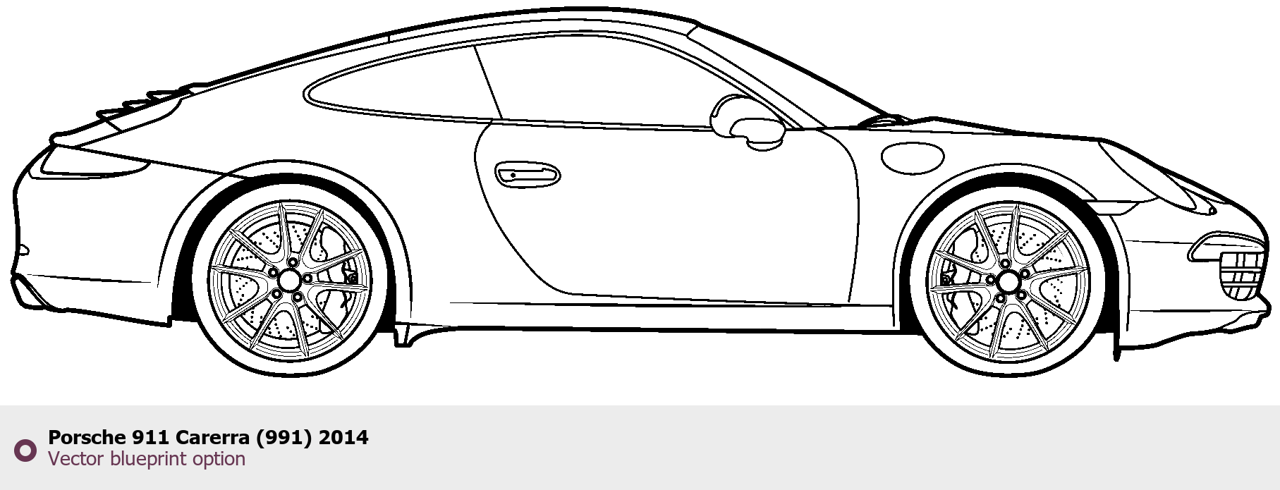 Raster blueprint of the 2014 Porsche 911 Carerra (991) Tag. This free downloadable image can be used for graphic projects, digital design, and 3D modeling. The file provides accurate exterior proportions of the vehicle. Model year: 2014. Body type: Tag.