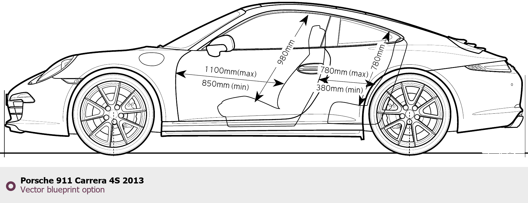 Raster blueprint of the 2013 Porsche 911 Carrera 4S Tag. This free downloadable image can be used for graphic projects, digital design, and 3D modeling. The file provides accurate exterior proportions of the vehicle. Model year: 2013. Body type: Tag.