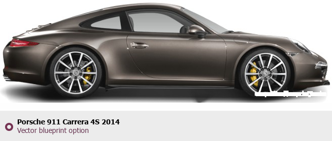 Raster blueprint of the 2014 Porsche 911 Carrera 4S Tag. This free downloadable image can be used for graphic projects, digital design, and 3D modeling. The file provides accurate exterior proportions of the vehicle. Model year: 2014. Body type: Tag.