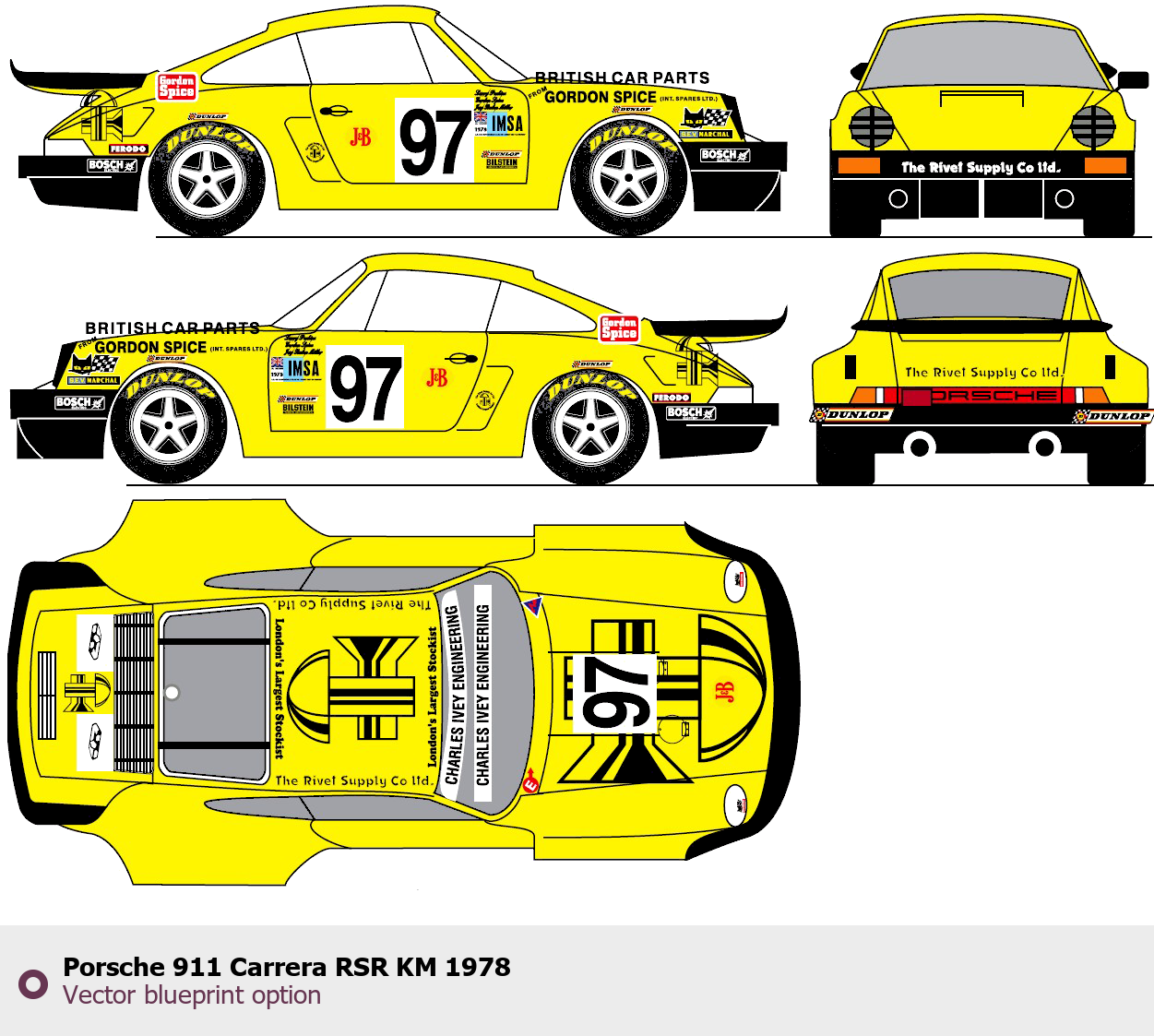 Raster blueprint of the 1978 Porsche 911 Carrera RSR KM Tag. This free downloadable image can be used for graphic projects, digital design, and 3D modeling. The file provides accurate exterior proportions of the vehicle. Model year: 1978. Body type: Tag.