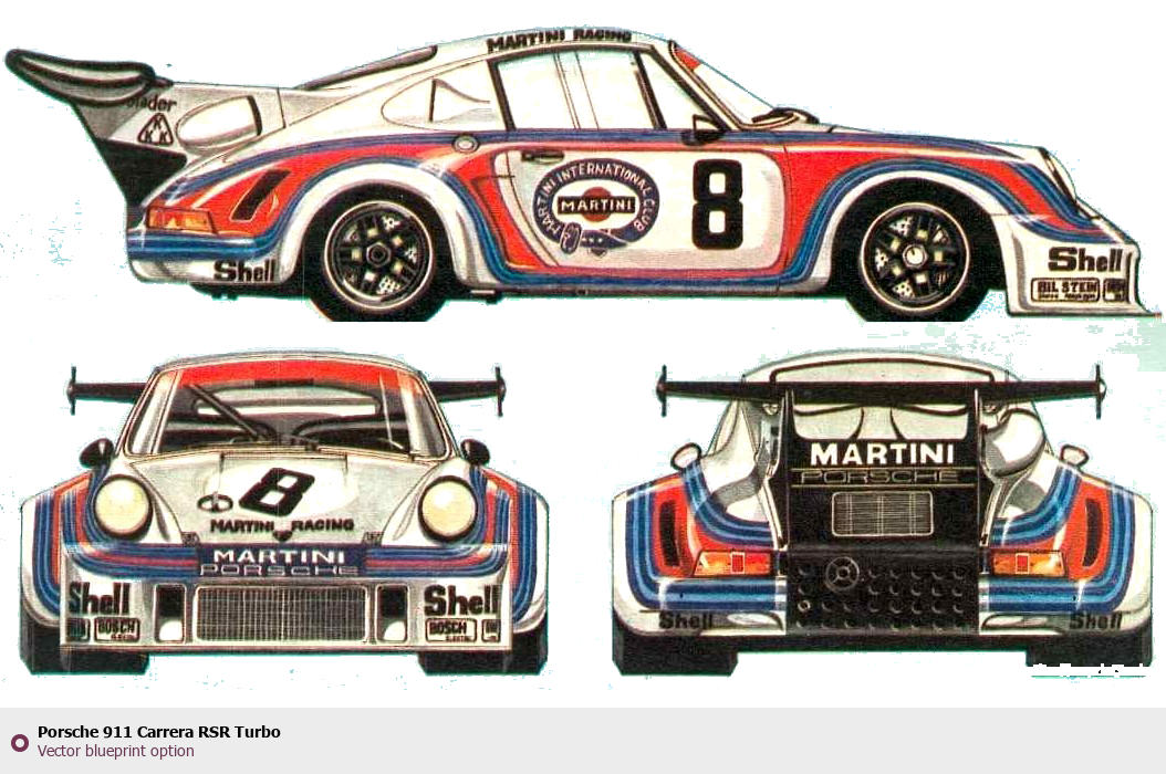 Raster blueprint of the Porsche 911 Carrera RSR Turbo Tag. This free downloadable image can be used for graphic projects, digital design, and 3D modeling. The file provides accurate exterior proportions of the vehicle. Body type: Tag.