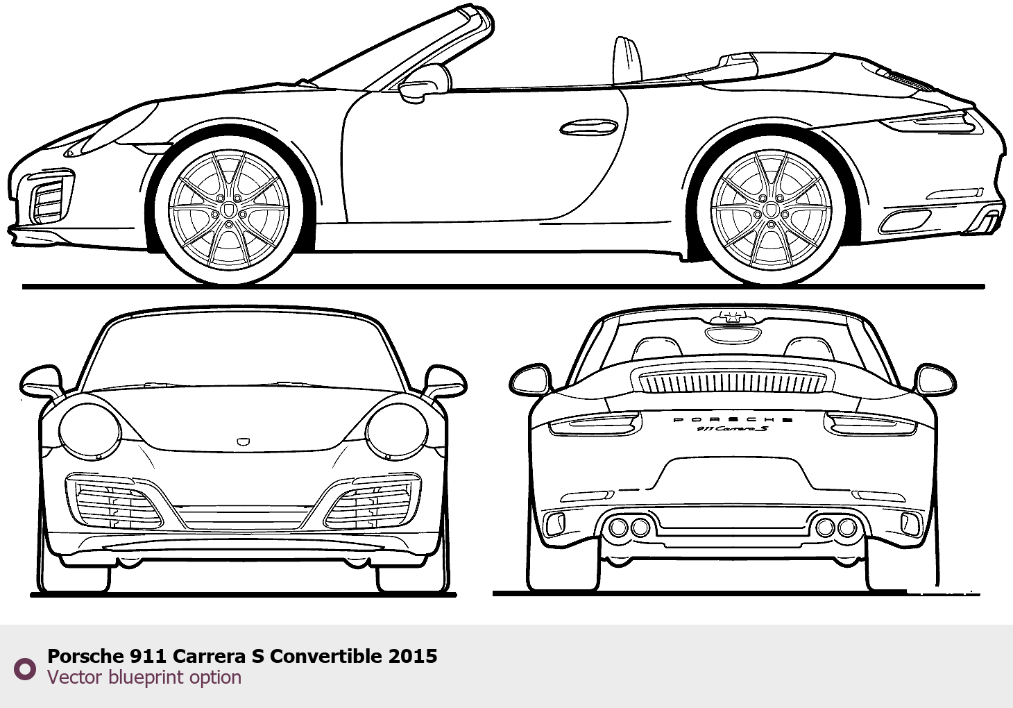 Raster blueprint of the 2015 Porsche 911 Carrera S Convertible Cabriolet. This free downloadable image can be used for graphic projects, digital design, and 3D modeling. The file provides accurate exterior proportions of the vehicle. Model year: 2015. Body type: Cabriolet.