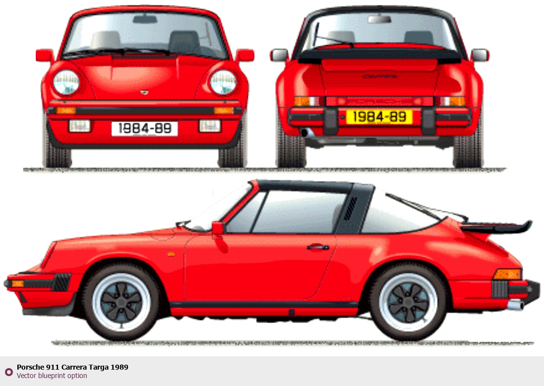 Raster blueprint of the 1989 Porsche 911 Carrera Targa Targa. This free downloadable image can be used for graphic projects, digital design, and 3D modeling. The file provides accurate exterior proportions of the vehicle. Model year: 1989. Body type: Targa.
